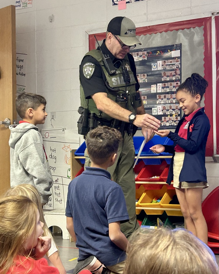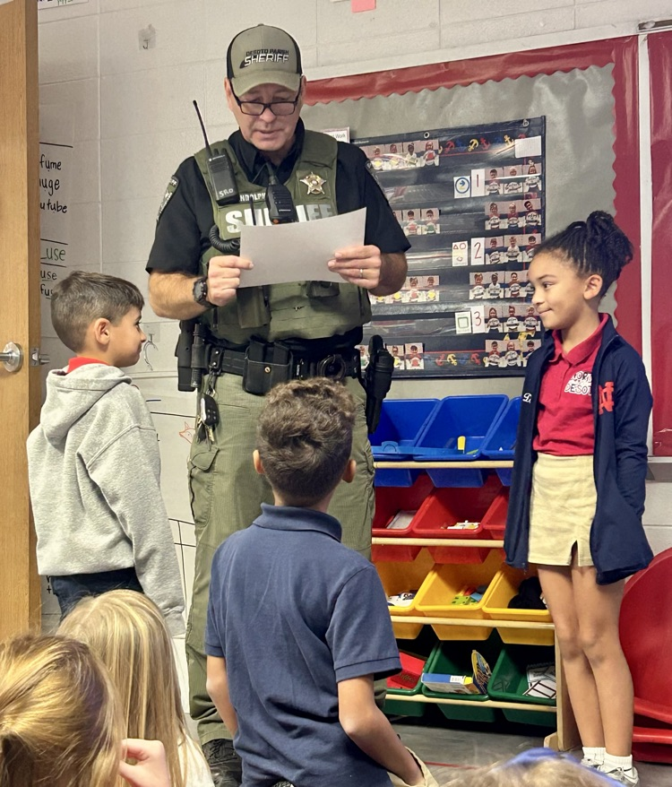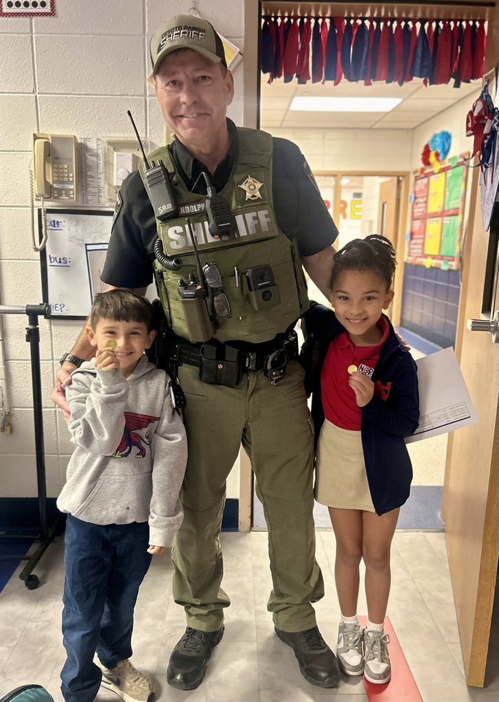 ⭐️ 📖 When students are nominated for leadership coins from a staff member, our Security Resource Officer Deputy Randolph delivers the news! 🗞️ He tells the class why the students were nominated and delivers their coin to be used in the book machine. Thank you, Mrs. Register, for sharing these pictures! ♥️💙