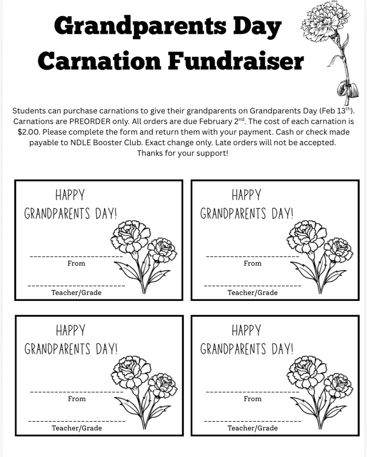 NDLE Booster Club will accept Carnation Orders for Grandparents Day until Wednesday, February 4th. Please get your orders in.